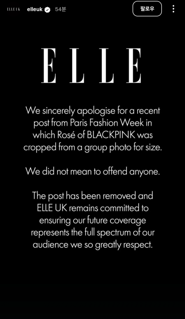 해당 게시물은 삭제되었으며, ELLE UK는 앞으로