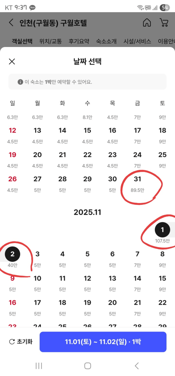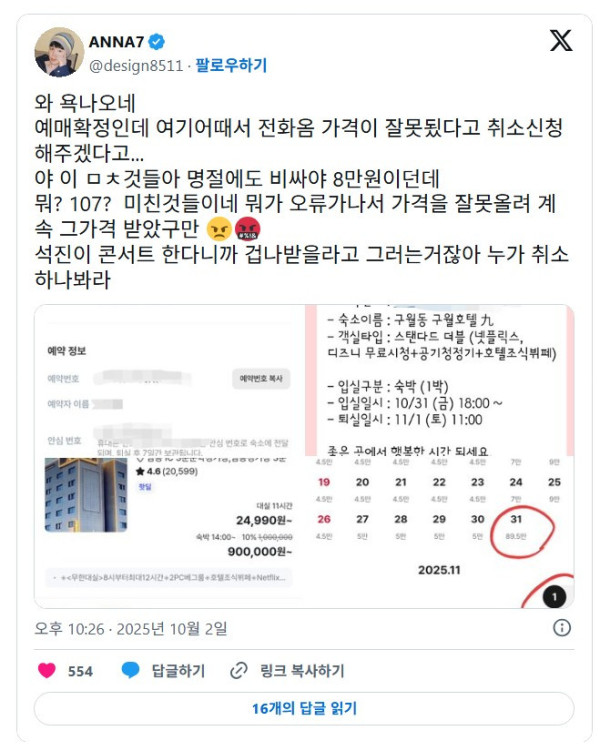 5만 3천원에 예약한 숙소를 107만원으로 올려버림