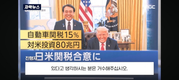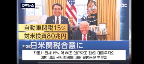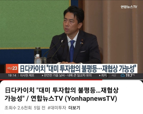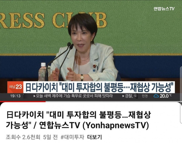 며칠전 일본 토론 프로에 나와 미국과의 관세협약에 대해 불평등하지 않았느냐는 질문에 유일하게 손을 들어 "운용과정에서 불평등한 부분이 나타나면 재협상 가능성이 있다" 고 말했던 새 일본 총리 다카이치 사나에