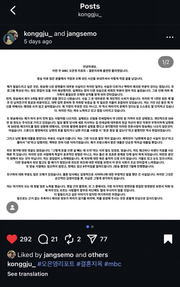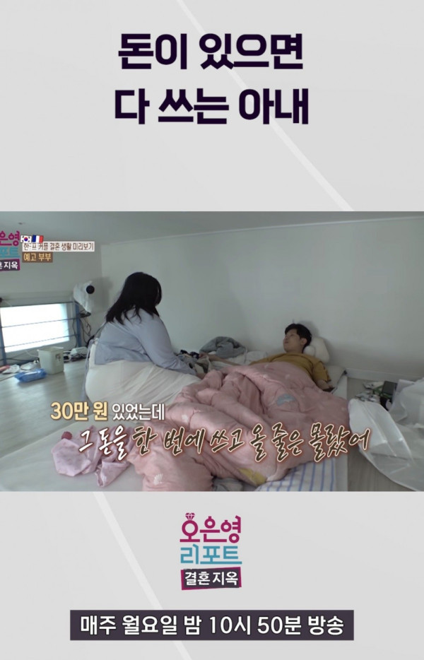 최근 아파트 전세집으로 이사를 해서 전세금이 묶여 있었고. 그로 인해 남편한테 손벌린 상황을 설명 했음에도 방송에선 편집돼서 안 나감.