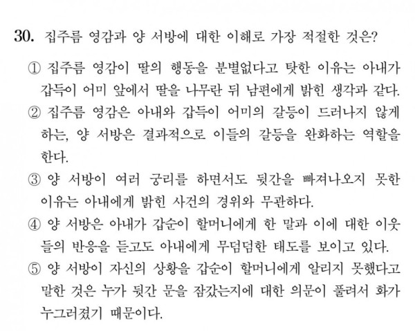 특히 본문에서 파악하기 힘들었던 정보가 인물 정보인데, 그걸 물어본 30번 문제는 정답률 31%를 기록하여 독서 영역 난이도의 정점인 22학년도 수능 '브래턴우즈 체제' 지문과 비슷한 정답률을 형성했다. 그렇게 <골목 안>은 원 제목 대신 '할매턴우즈' 라는 별명이 붙었다.
