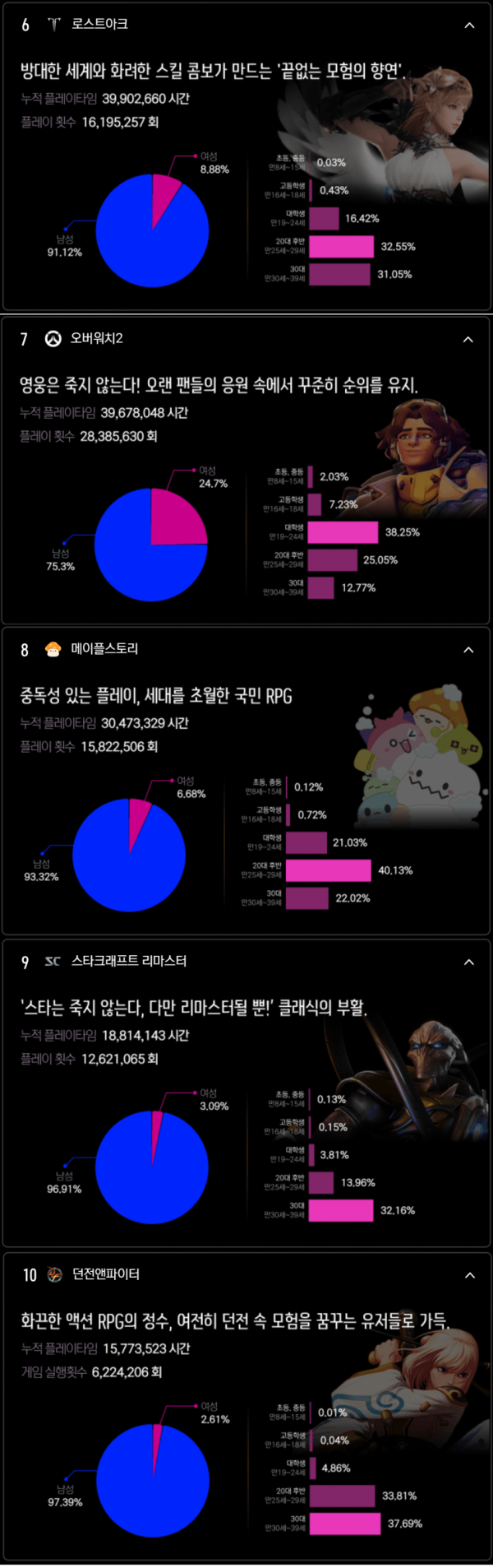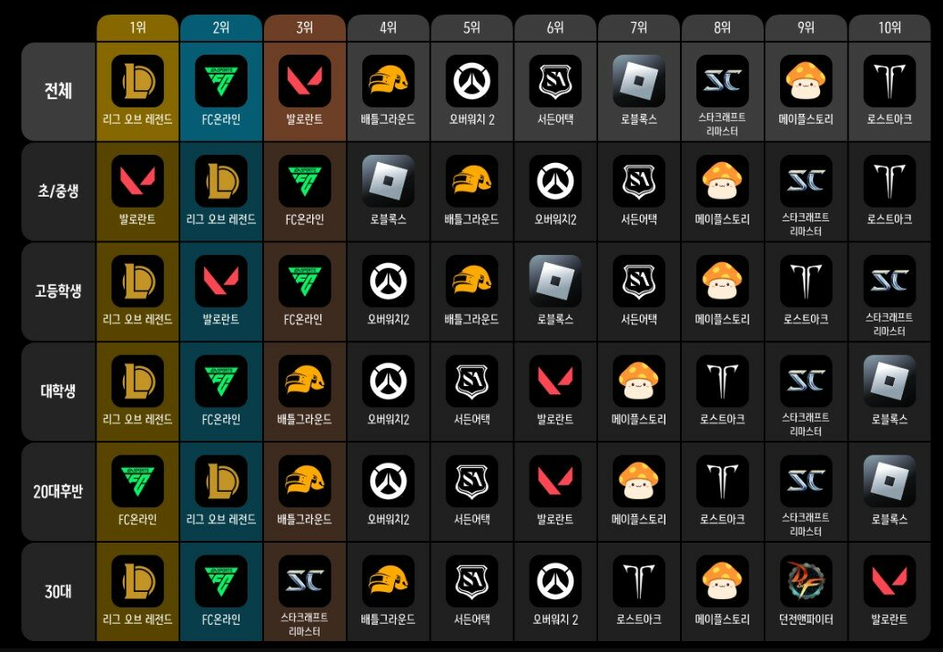 게임별로 보면 발로랑 로블록스는 확실히 연령층이 어리단 게 보이네
