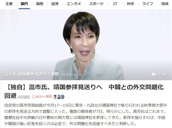 자민당의 타카이치 사나에 총재가 이번 달 17~19일에 도쿄·구단키타의 야스쿠니 신사에서 거행되는 추계 예대제중의 참배를 보류하는 방향으로 조정에 들어갔다.
