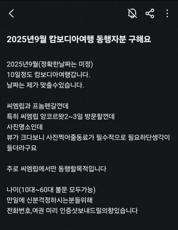 열람중 캄보디아 여행 동행자 구해요 등급아이콘 레벨아이콘 커뮤관리자 16:03 46