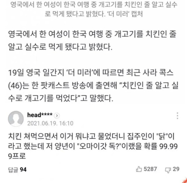 한국 여행 중 개고기를 실수로 먹은 영국여자
