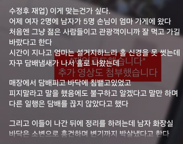 1. 여자 2명, 남자 5명이 어머니 가게에서 담배를 피우고 침을 뱉는 등 ㅈ같은 짓거리함