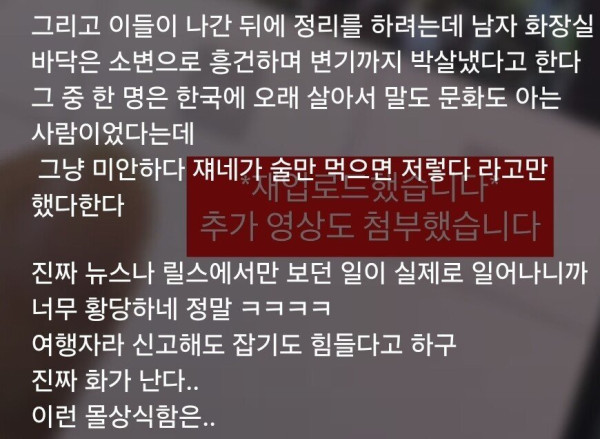 3. 한 명은 한국에서 좀 살았던지라 따졌더니 “술만 먹으면 저렇다”며 형식적인 사과만 함.