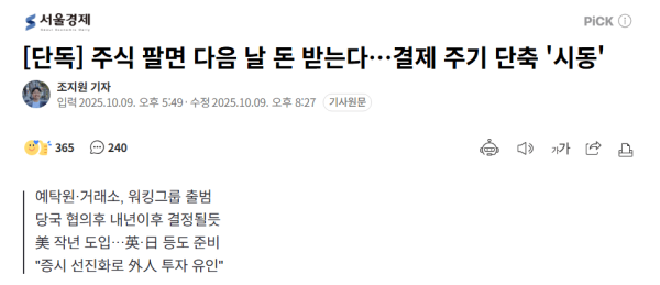 주식 팔면 다음 날 돈 받는다…결제 주기 단축 '시동'