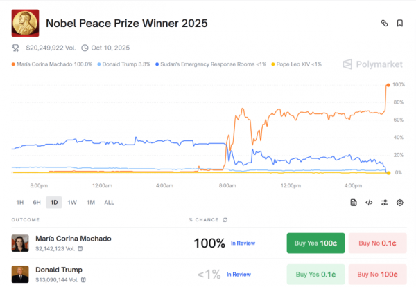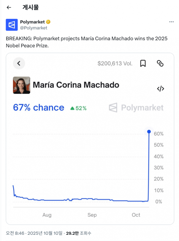 오늘 오전부터 1명이 마차도를 계속 매수해서 2%(거의 될 확률 없음, 트럼프는 4% 였음)가 75%까지 올라갔음