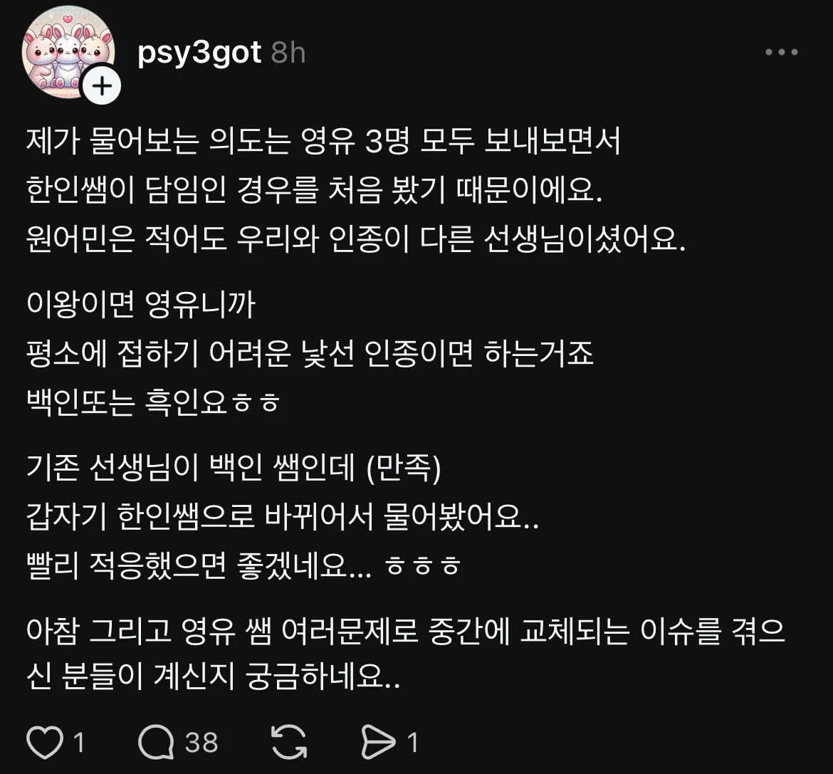 영어유치원 담임이 교포면 어떡하냐는 아줌마
