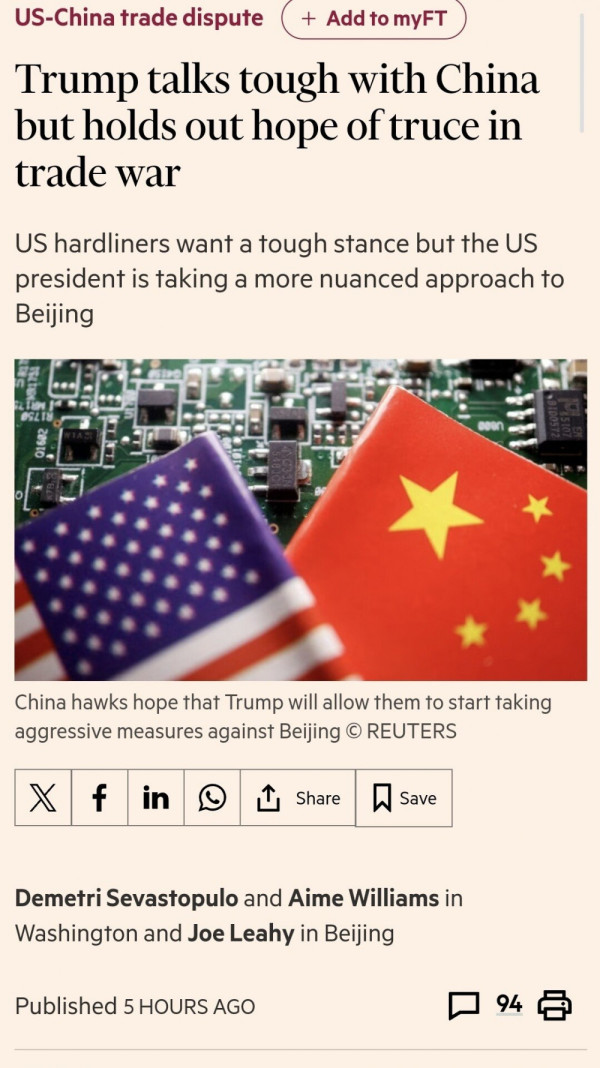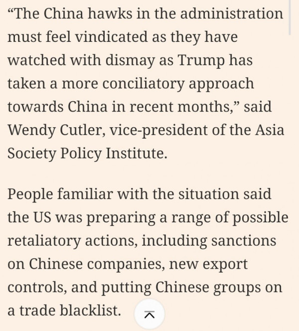 그러자 트럼프 행정부 대중국 강경파들은 중국에 압력을 가해야할 타이밍에 트럼프가 최근 계속 중국이랑 타협할려는게 아닌가 갈수록 의혹이 증가하고 있다하며 실망하고 있다고. 특히 중국 기업 제재 및 수출 통제등 보복 수단을 설립하던 와중 이래서.