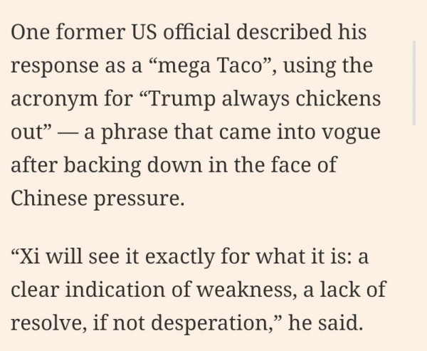전직 미국 관리는 이를 두고 ' 메가 타코 ( 트럼프는 항상 쫄아서 튄다) ' 라며 중국이 압박 넣자 또 물러선다고.