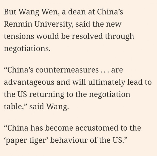 중국 인민대 교수인 왕웬이 중국 입장을 설명하기를 ' 희토류등 중국의 보복 수단이 미국 대비 유리하고 결국 미국이 협상장으로 돌아와 중국에게 협상해달라고 할 것' 이라 본다함.