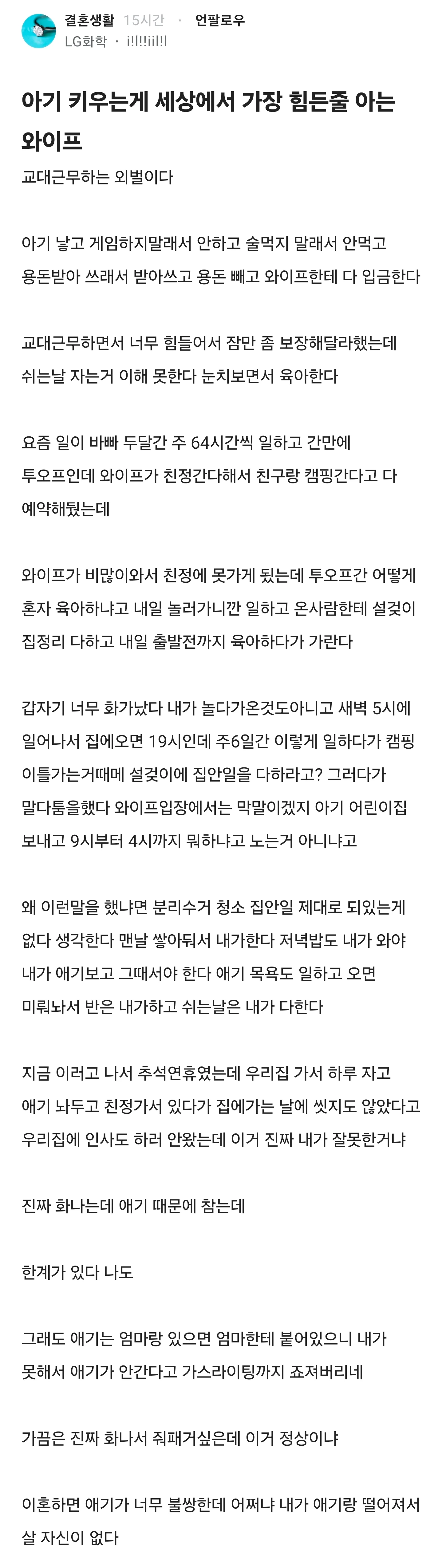 아기 키우는게 세상에서 제일 힘든줄 아는 와이프