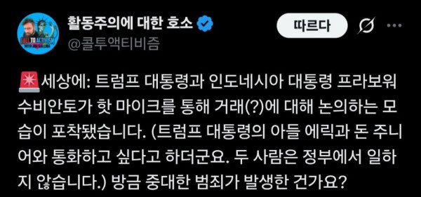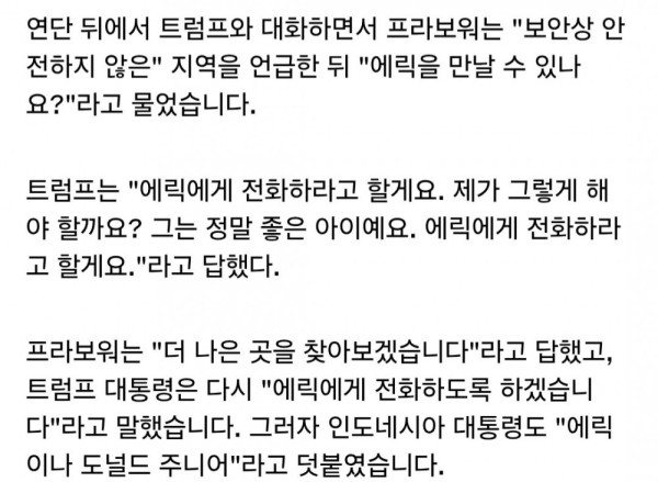 이번에는 트럼프와 인도네시아 대통령 프라보워의 핫마이크가 논란이 되는중 (영상은 길어서 뒤에 11초 짤림. 펨코는 45초까지만 가능하네요)