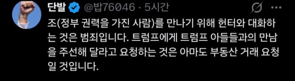 한국 대통령이 타국 정상과 사업 관련 얘기를 하면서 대통령 가족에게 연락하라고 전달하겠다 라는 대화가 유출되면 우리나라는 비난 여론도 크고 위법적이라는 반응도 많이 나올거 같은데.. 미국은 법적으로 문제 없는 행위인가?