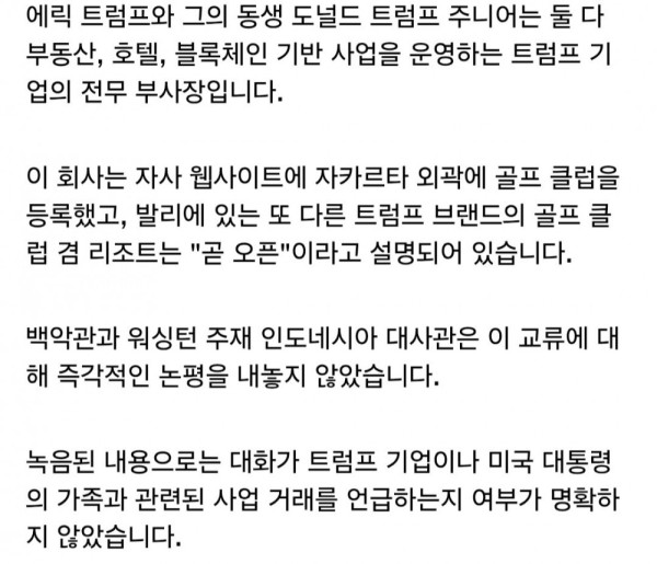 인도네시아에 추진중인 트럼프 브랜드의 각종 사업 관련 대화로 예상. (사업 아니고 갑자기 사적으로 만날 관계도 아니고..)