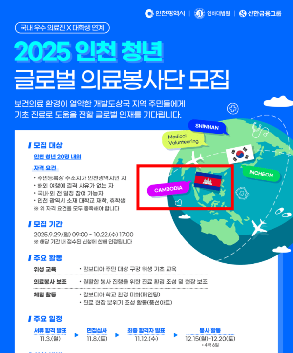 인천시에서 캄보디아로 갈 청년 20명을 급구합니다