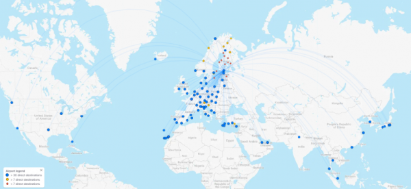 유럽~동아시아에서는 핀란드의 국적사 핀에어가 비슷한 전략을 택하고 있었음. 코로나 이전까지 유럽~헬싱키 경유~동아시아 항공권을 싼 값에 파는걸로 유명했었으며, 코로나 이전에는 동아시아의 2선급 도시인 나고야, 후쿠오카, 충칭, 난징 등에 취항하고 있었고 부산 취항도 추진했었음.