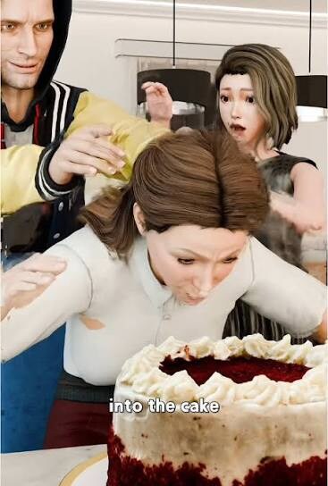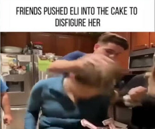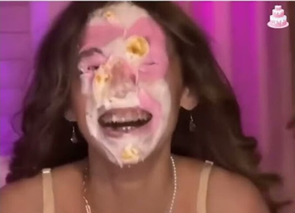친구나 가족이 일부러 얼굴을 케이크로 밀어서