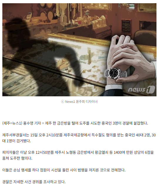 제주 금은방서 1400만원어치 털어 도주 중국인 3명 공항서 붙잡혀