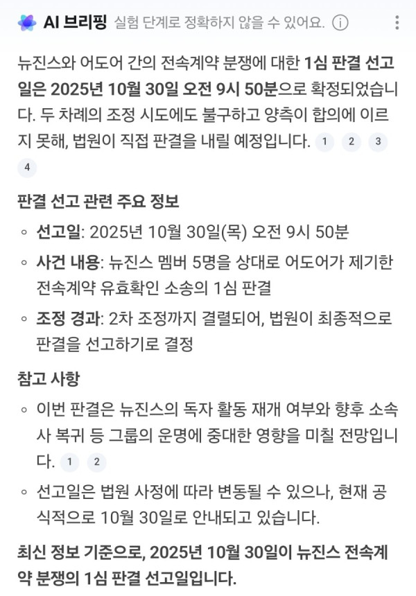 10월30일... 판결결과에 따라서 뉴진스 멤버들 인생이 바뀌겠네요