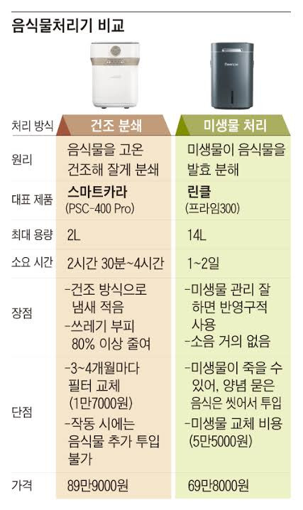 건조분쇄형은 아무거나 막 돌려도 되지만 필터 유지비가 꽤 들고, 건조된거 다시 음쓰처리 해야됨, 내솥 세척 관리 꾸준히 해줘야하고 내구성때문에 나중에 눌러붙는 문제 생김. 필터 3~4개월 교체 권장인데 맞춰서 바꿔주면 냄새는 잘 안난다고함