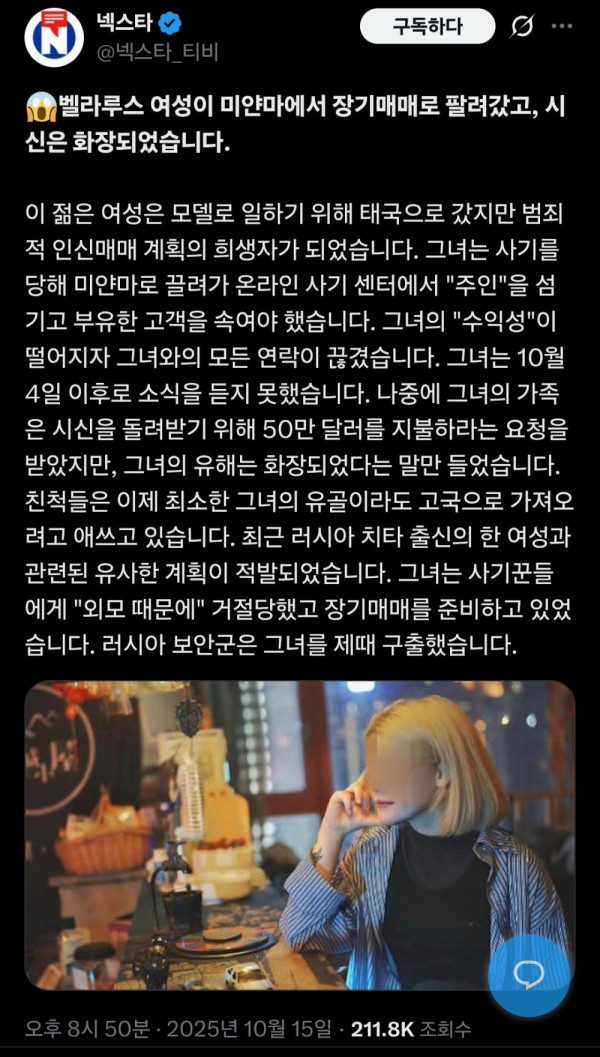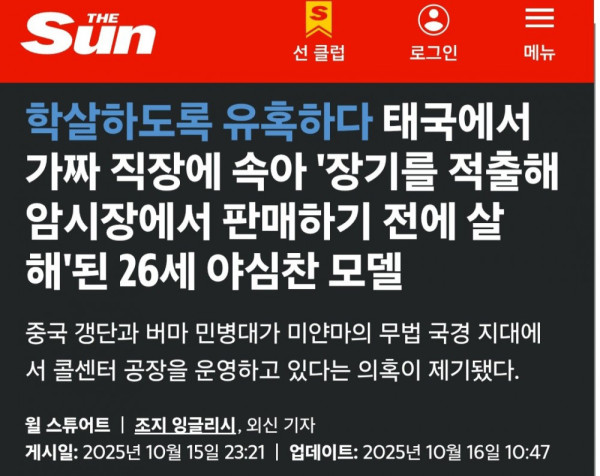 태국에서 조차 납치 당해서 미얀마로 끌려갔다가 이후 사기에 강제 가담> 사기 실적이 줄어들자 장기 적출 후 살해 ㄷㄷ