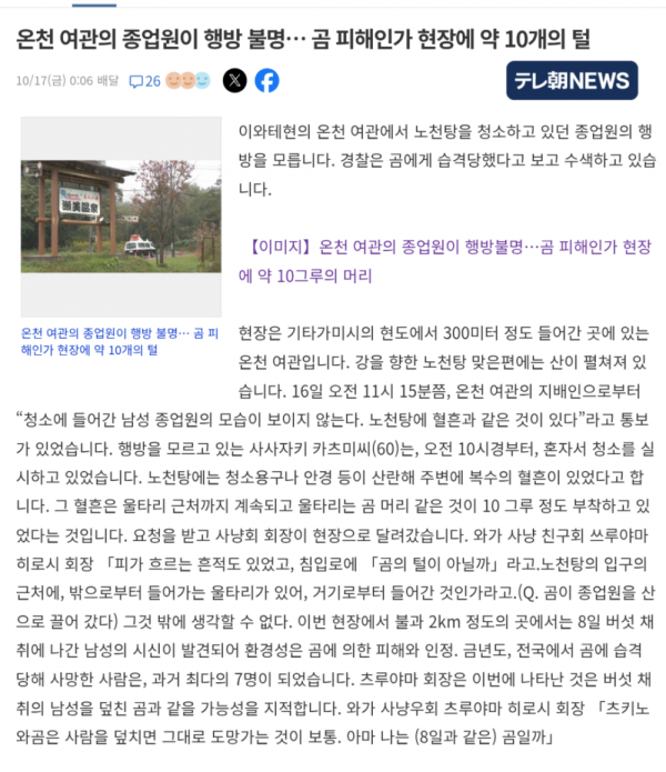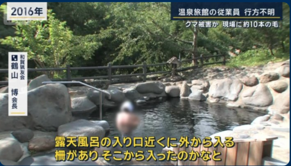 온천 노천탕 청소하던 종업원 야생곰 습격으로 인해 실종됨