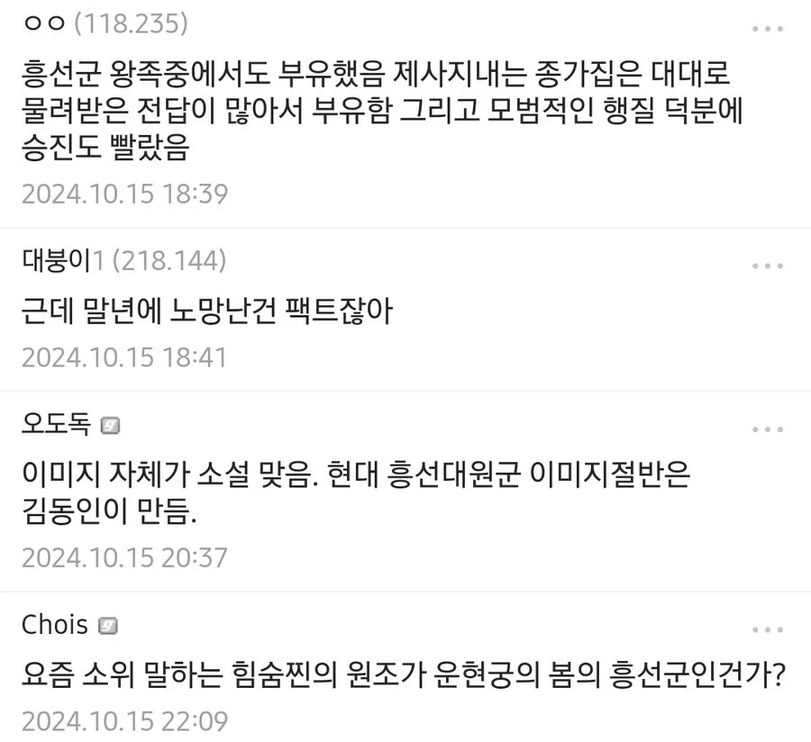 우리가 흔히 아는 대원군의 이미지는 카네히가시 후미히토가 쓴 운현궁의 봄 소설의 이미지라고 함.