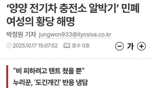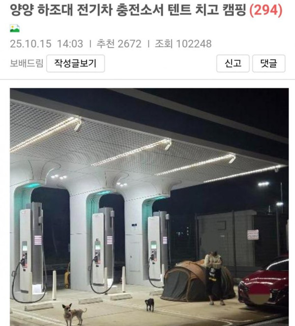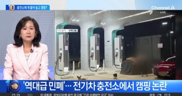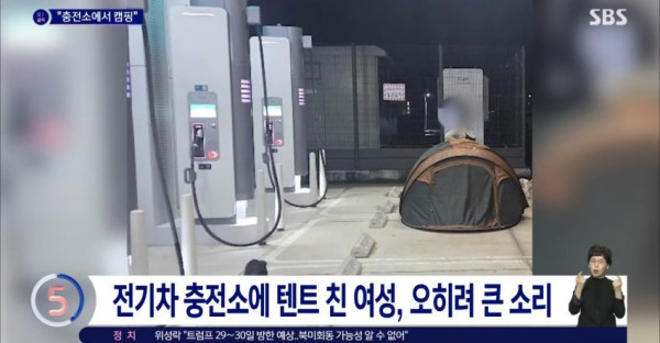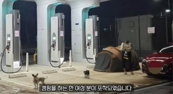 요약 : 보배드림 제보로 뉴스 탔던 개들 데리고 전기차 충전소에서 캠핑하는 민폐녀,