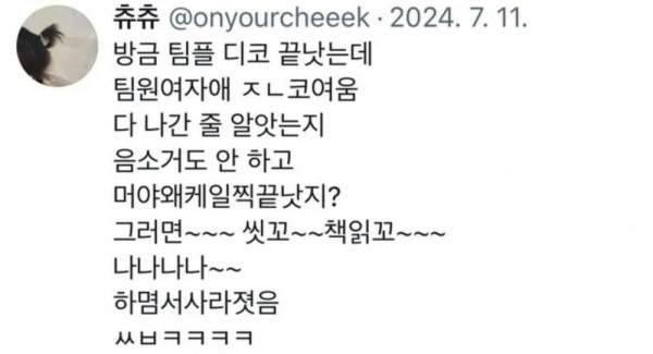 열람중 팀플 끝난 줄 알았던 여자애 디코 유출 등급아이콘 레벨아이콘 커뮤관리자 09:39 39