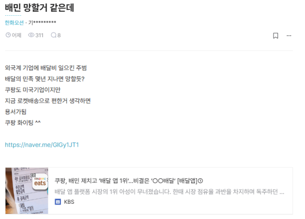 배민 서울 1위 뺏긴 후 블라인드 근황