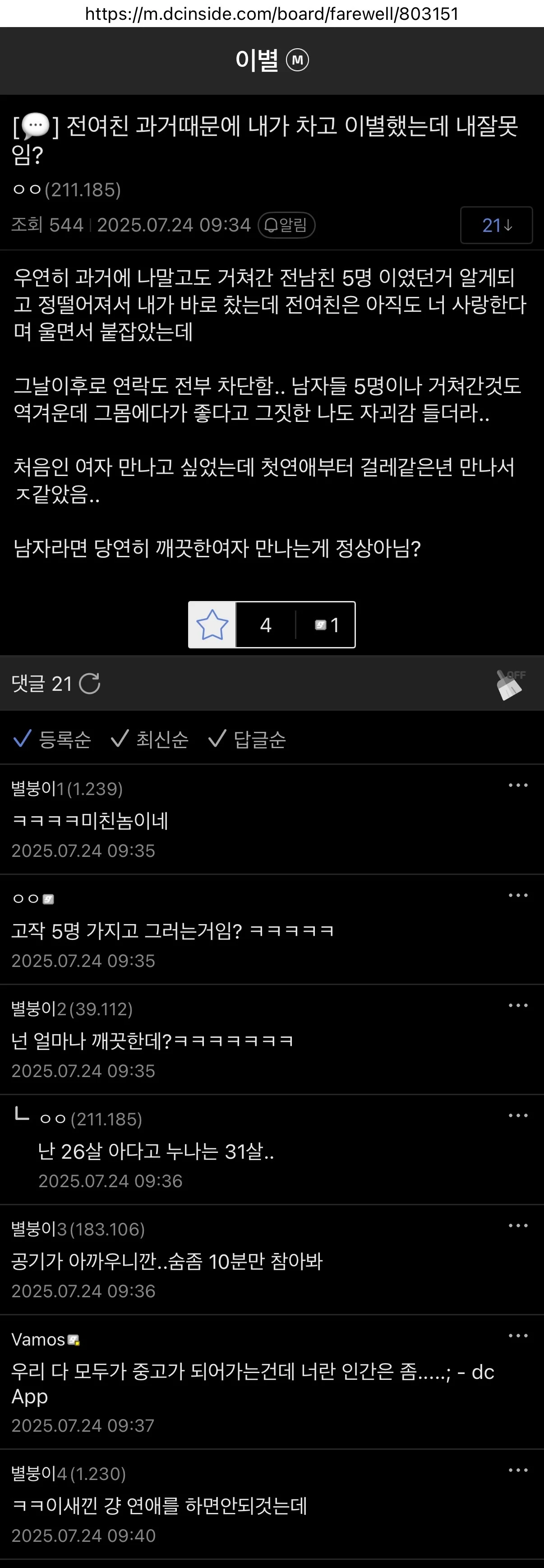 댓글보니 글쓴이는 26살 남자인것 같은데 여자나이 31살에 5명이면 많은건가? ㄷㄷ...