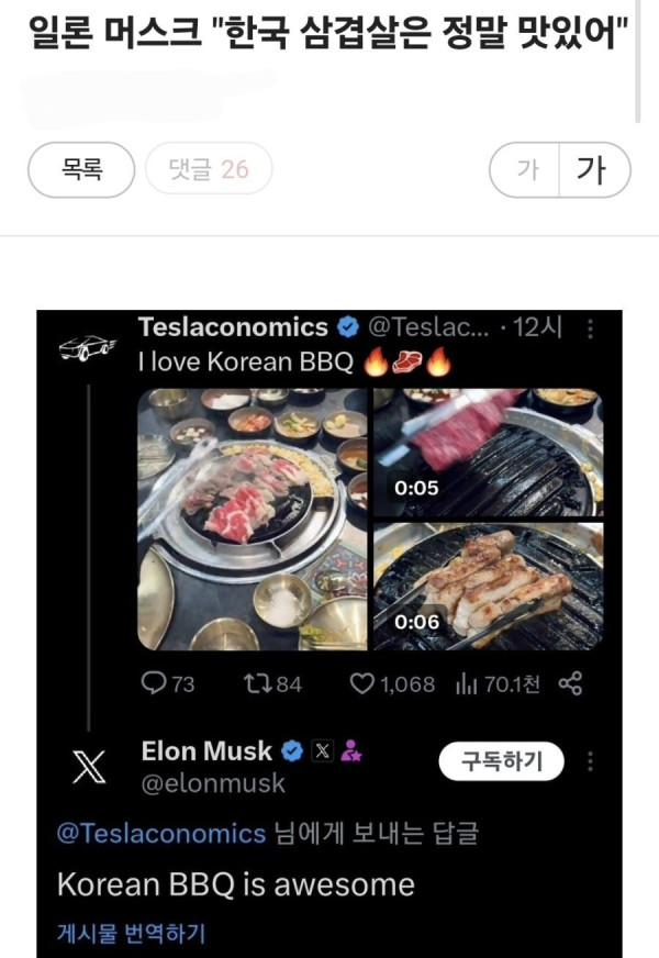일론 머스크 "한국 삼겹살 정말 맛있어"
