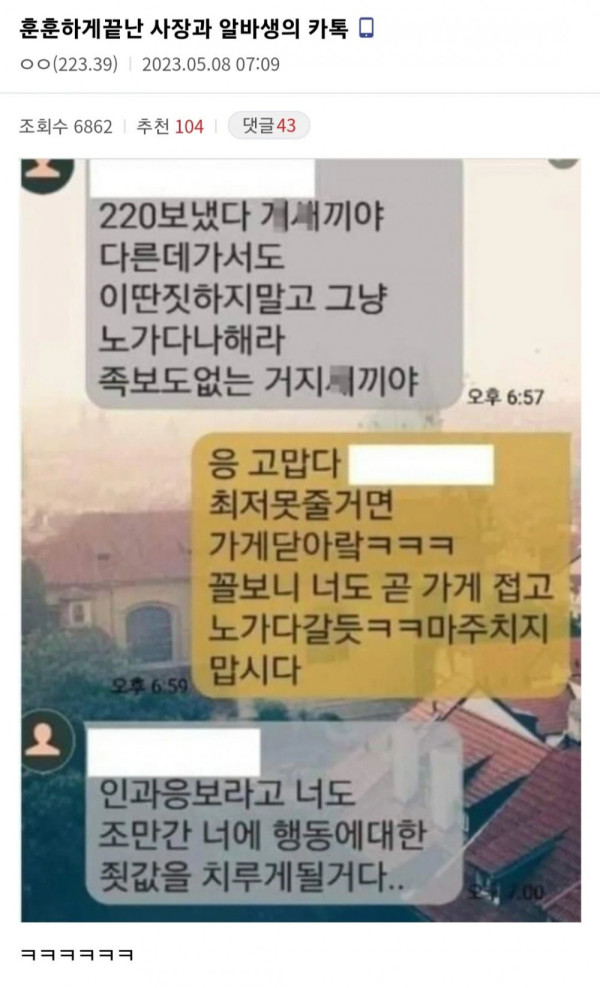 싱글벙글 훈훈하게 퇴사한 편의점 알바생과 사장의 카톡