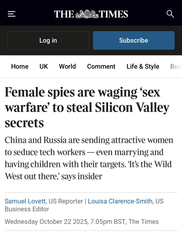 요즘 실리콘밸리에 엄청 이쁜 중국, 러시아 스파이들이 미인계로 IT 업계인들을 타겟하고 있다고함.