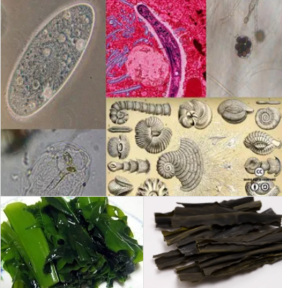 짚신벌레, 아메바, 유글레나, 미역, 다시마, 파래, 돌말, 반달말, 플라스모듐(말라리아원충), 깃편모충(Choanoflagellatea)