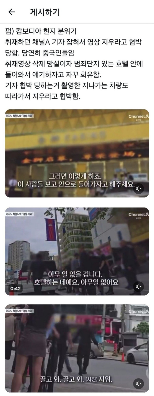 캄보디아 취재진들에게 자꾸 건물 들어가자고 하는 조직원들