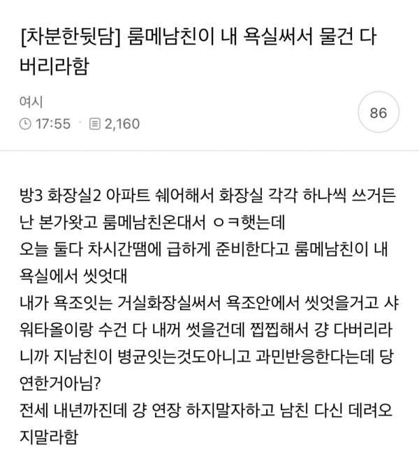 룸메 남친이 내 욕실 써서 물건 다 버리라함