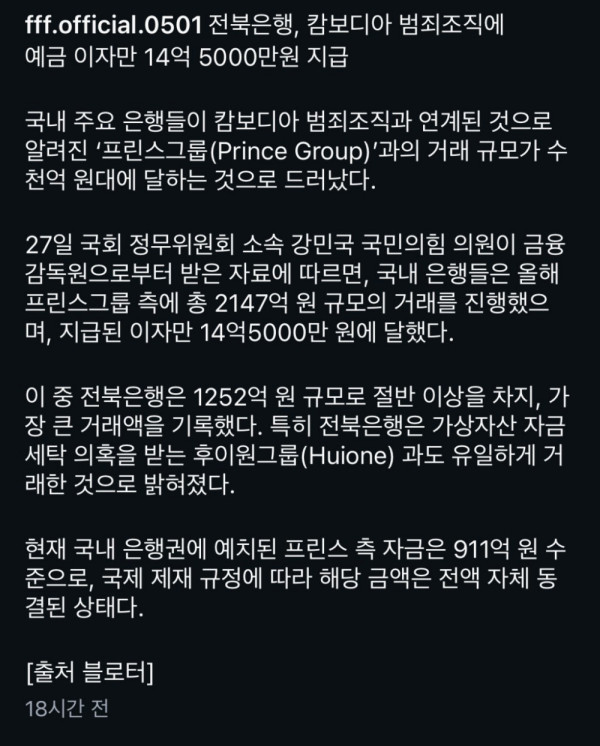 캄보디아 범죄 총책으로 미국에게 찍힌 중국 프린스 그룹과 1000억원대 거래액으로 엮인 전북은행