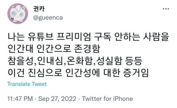 유튜브 프리미엄 안쓰는 사람들 존경함