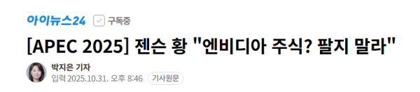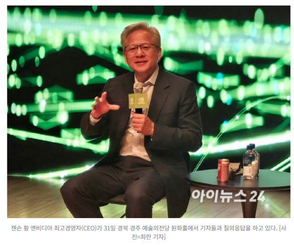 황 CEO는 이날 경북 경주예술의전당에서 열린 엔비디아 프레스 컨퍼런스에서 ‘투자 관점에서 엔비디아를 바라보는 기준’을 묻는 질문에 “개별 투자 조언은 하지 않지만, 내 생각은 분명하다”며 이같이 답했다.