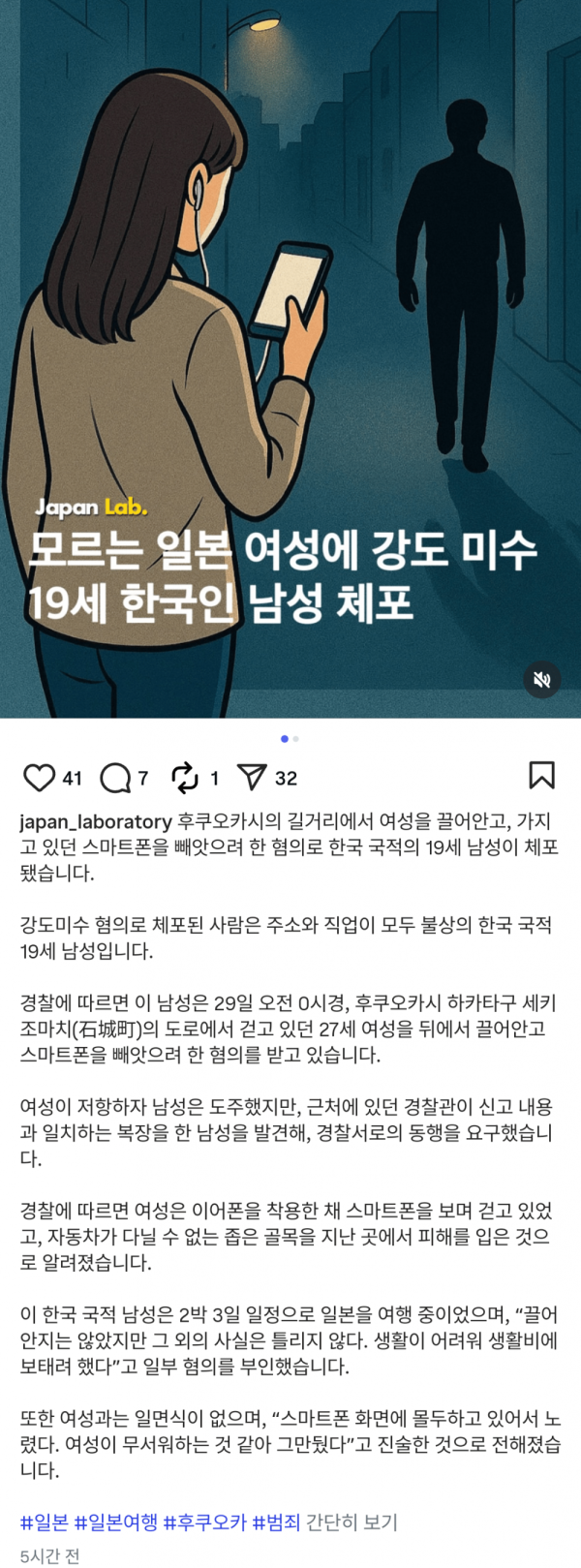 모르는 일본여성 강도 미수 한국인 체포