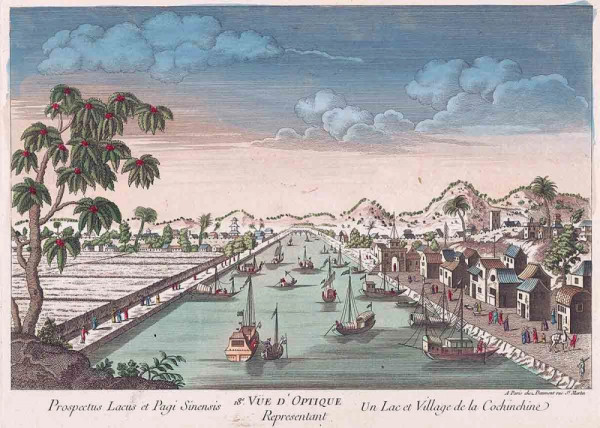 장 프랑수아 뒤몽이 1760년경에 그린 메콩 강 삼각주에 있는 마을을 묘사한 수채화 석판화