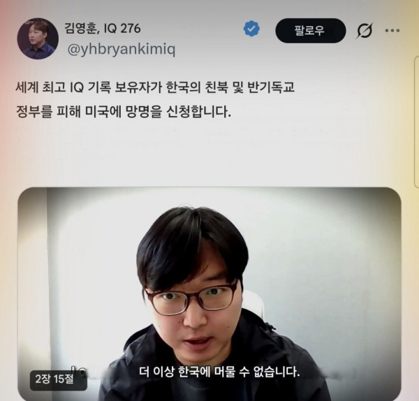 아이큐 276 세계1위 한국인 미국으로 망명신청