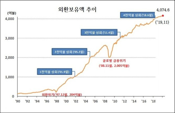Imf 외환위기때와 글로벌 금융위기때 대응을 위해 일시적으로 급락한 이후에는 꾸준히 상향 추이임