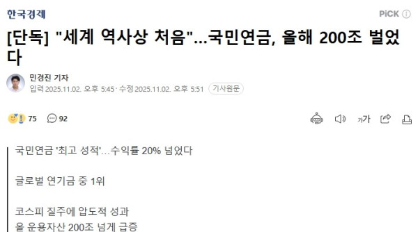 세계 역사상 처음…국민연금, 올해 200조 벌었다 | 한국경제