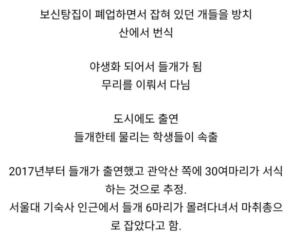 보신탕집 폐업 여파, 서울대 들개 피해 속출