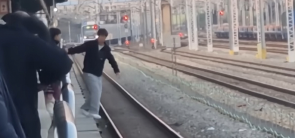 승강장 바깥으로 몸을 내미는 장난을 치는